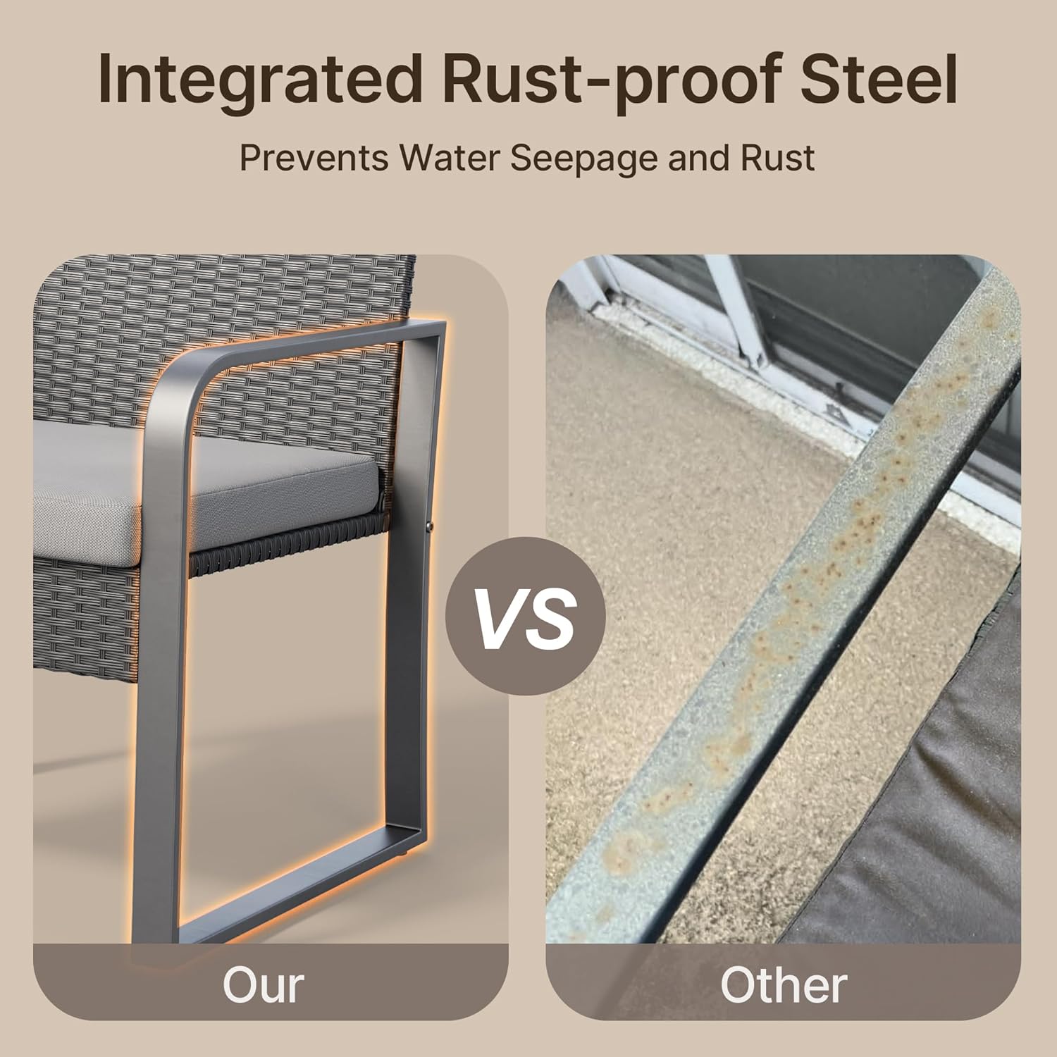 - Stable and Durable: This 3-piece patio bistro set features a powder-coated steel frame that offers strong support and rust resistance. The all-weather PE rattan is lightweight, fade-resistant, and has good load-bearing capacity