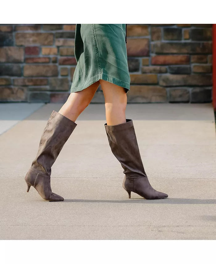 A bold pointed-toe and a kitten heel enhance this classic knee-high boot by Journee Collection. The Vellia is a vegan leather silhouette with a straight shaft and pull-on design with a minimalistic look.