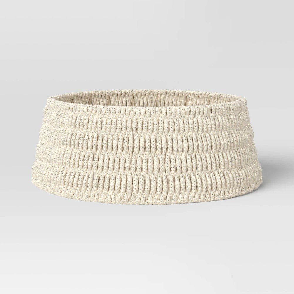 Elevate your holiday decor with the Wondershop 26" Christmas Tree Collar, featuring a chic white and gold woven rope design. This stylish collar adds a modern touch to any tree, blending seamlessly with both contemporary and classic decorations.